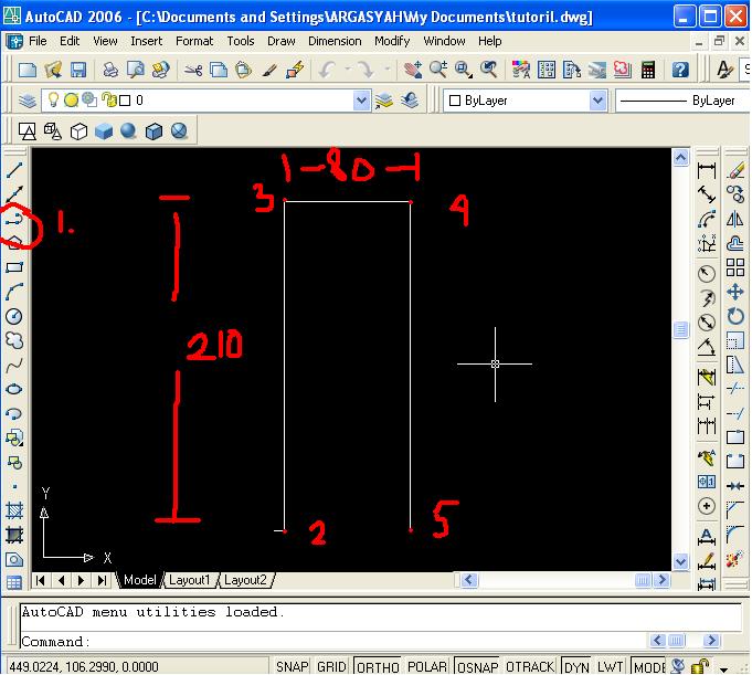 5. Gulung pake scrool untuk memperkecil, kemudian buat lintasan dengan perintah spline, caranya lihat gambar dibawah perhatikan urutan nomornya